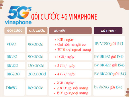 Hiện nay, chỉ với 15.000đ bạn đã có hội sở hữu ngay 3GB Data dùng trong 3 ngày khi đăng ký gói D3 Vinaphone. Hoặc 30.000đ có ngay 7 GB Data dùng 7 ngày với gói cước DT30 Vinaphone. Thông tin chi tiết gói cước ngay bên dưới
