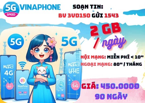 Gói cước 3VD150 Vinaphone chỉ 450.000đ ưu đãi 2GB mỗi ngày, gọi thả ga