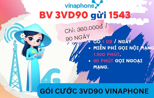 Đăng ký gói cước 3VD90 Vinaphone thành công, thuê bao quý khách sẽ có 3 tháng thoải mái sử dụng dịch vụ cùng ưu đãi sau :