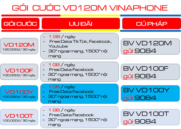 Ngoài gói cước 6VD120M của Vinaphone, còn có hai gói tương tự khác là 6VD100F và 6VD100Y. Dưới đây là một số so sánh giữa các gói cước này: