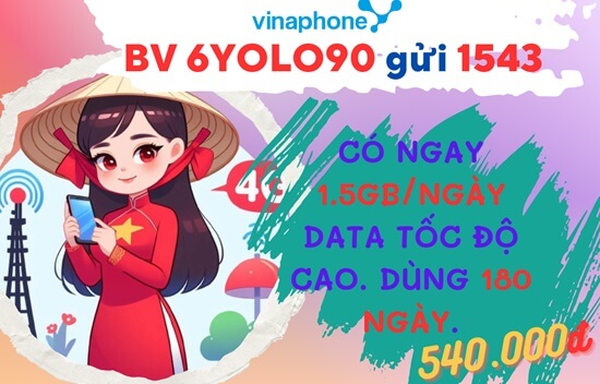 Gói cước 6YOLO90 Vinaphone được thiết kế với ưu đãi khá hấp dẫn. Chỉ với 540.000đ, gói 4G này đem lại cho người dùng 45GB data / tháng tốc độ cao, thoải mái online suốt 180 ngày. Tham gia gói, quý khách sẽ không còn nỗi lo phát sinh cước 4G/5G đắt đỏ. Với cách cộng data theo ngày của hệ thống, quý khách cũng không phải lo lắng cạn kiệt ưu đãi trong những ngày cuối của chu kỳ. Khám phá ngay thông tin gói 4G này để tận hưởng ưu đãi khi có nhu cầu nhé!