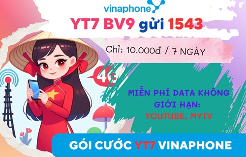 Bạn có thích sở hữu dung lượng ưu đãi thật lớn cho nhu cầu giải trí và kết nối data trên di động của mình không? Hãy tham gia gói cước YT7 Vinaphone! Đây là gói 4G được thiết kế dành cho các bạn trẻ tại khu vực 7. Chỉ với 10.000đ trong tài khoản chính kèm tin nhắn được gửi theo cú pháp: YT7 BV9 gửi 888, bạn sẽ nhận được ưu đãi hấp dẫn để sử dụng internet và giải trí không giới hạn trên di động suốt 30 ngày.